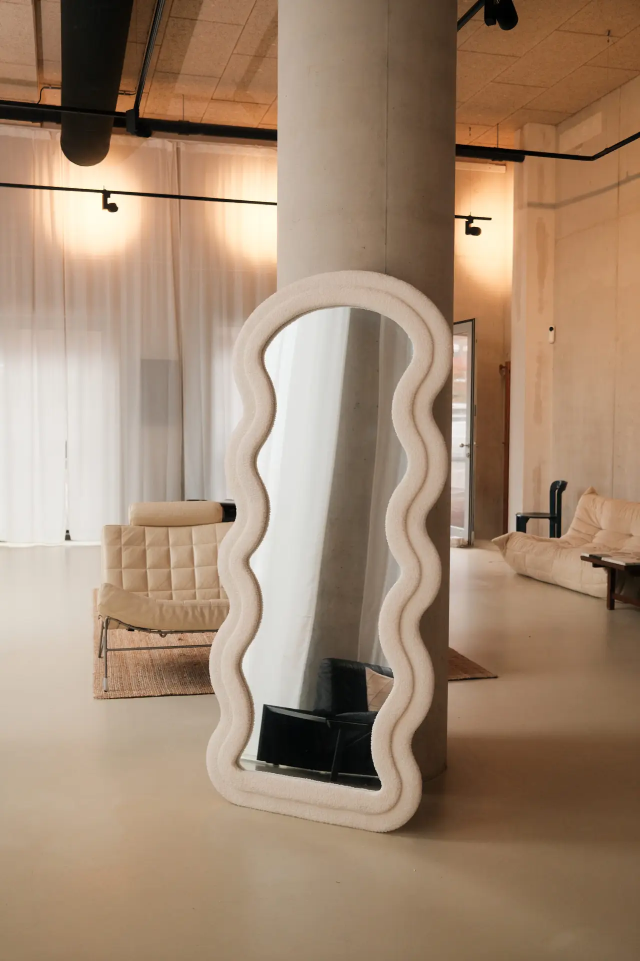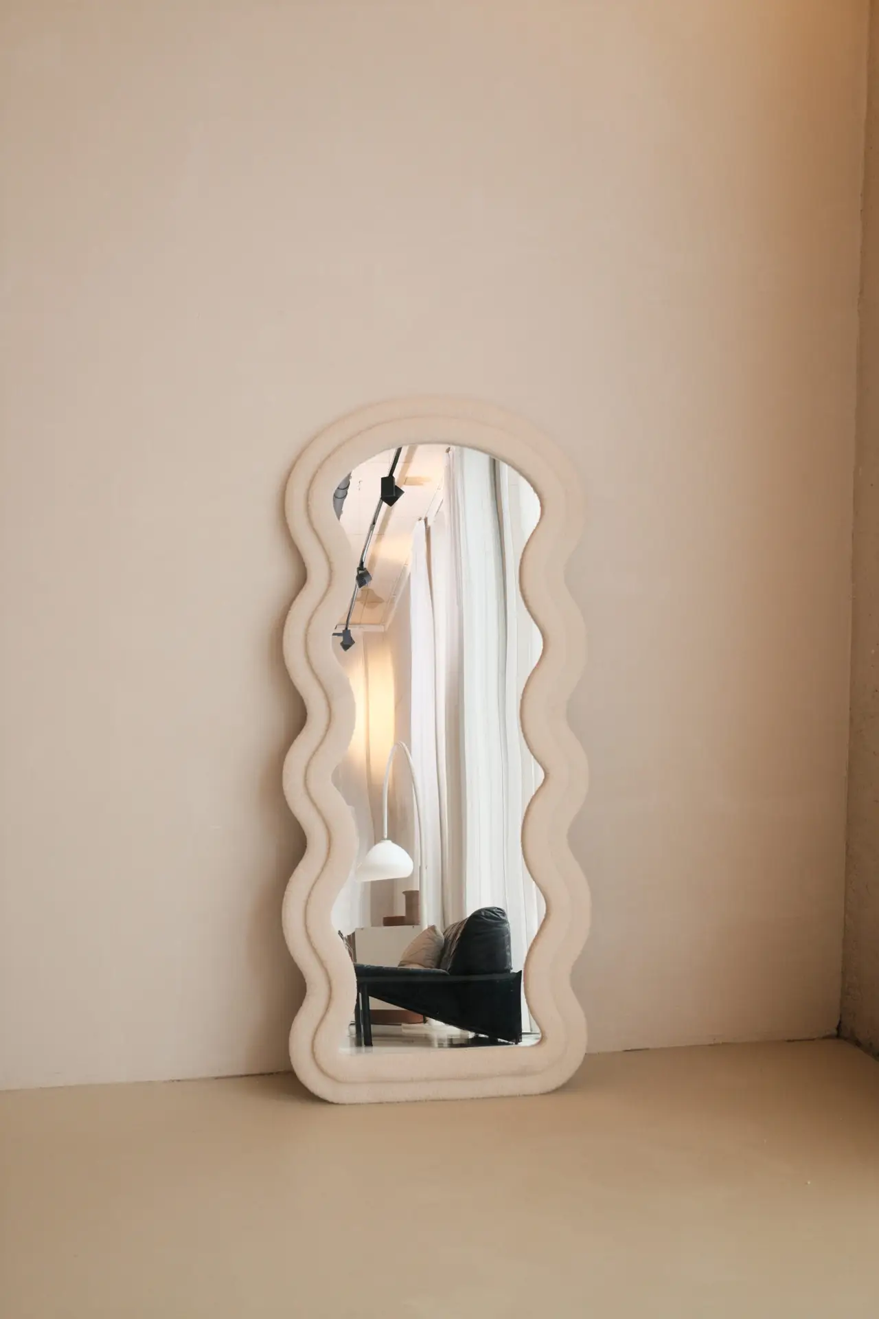 De Luna Teddy Mirror brengt warmte en zachtheid in elke ruimte. Met zijn elegante curvy vorm en luxe teddy stof rondom het frame is deze spiegel een echte eye-catcher voor moderne en cosy interieurs. De zachte, wollige textuur geeft een speelse maar toch chique uitstraling — perfect voor de slaapkamer, woonkamer, kleedkamer of kinderkamer.